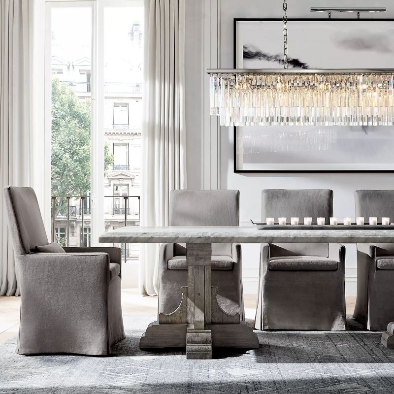 Inspired by the Art Deco style of 1920s Paris, the collection captures the period's fascination with geometric forms. Masterfully refracting the light, hundreds of faceted, dynamic prisms evoke the allure of the era. Hanging like lush fringe from a welded iron frame, the angular glass juxtaposes elegance and industrialism. |