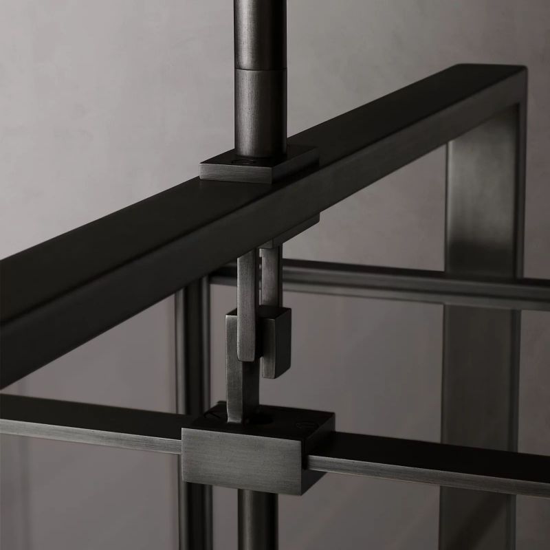 Inspired by the international style of glass and steel architecture, the collection's strong linear forms transcend utilitarianism with elegant proportions and a sense of weightlessness, offering a new modern interpretation of the classic lantern that appears to have glass volumes that seem to float within a ventilated metal frame. |